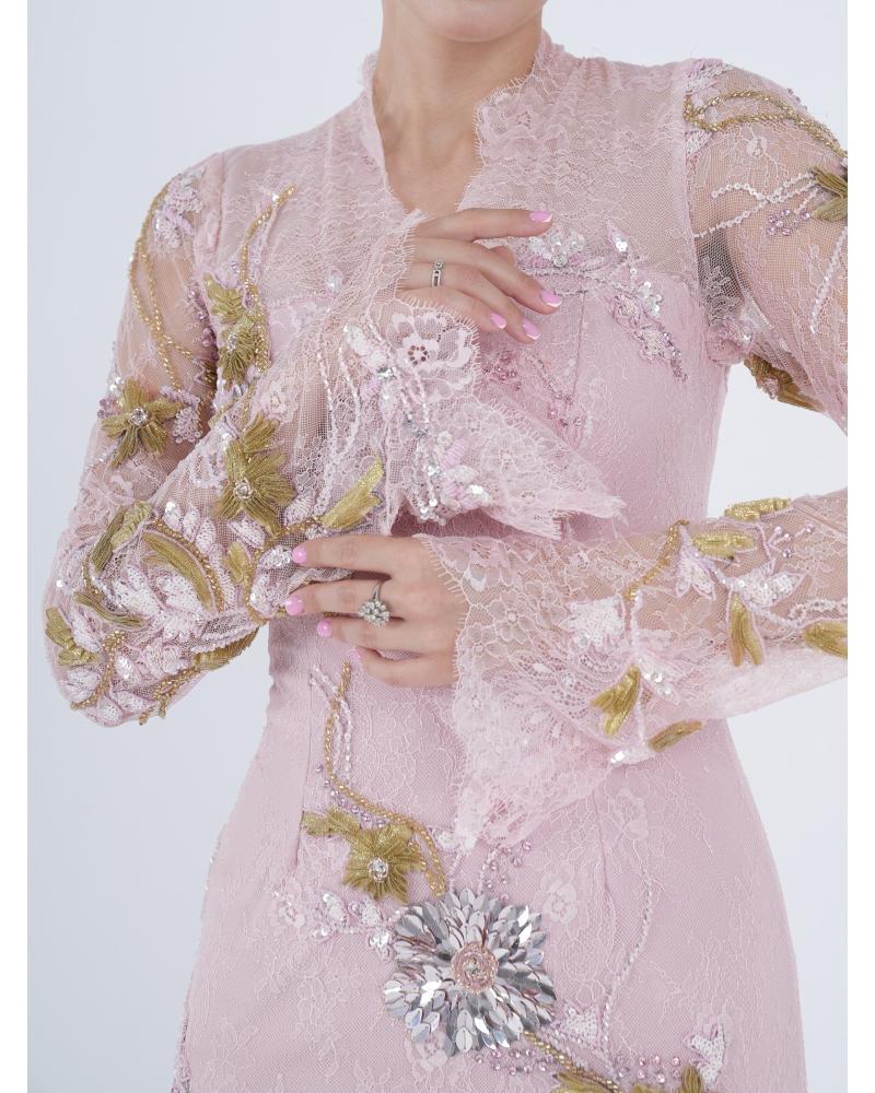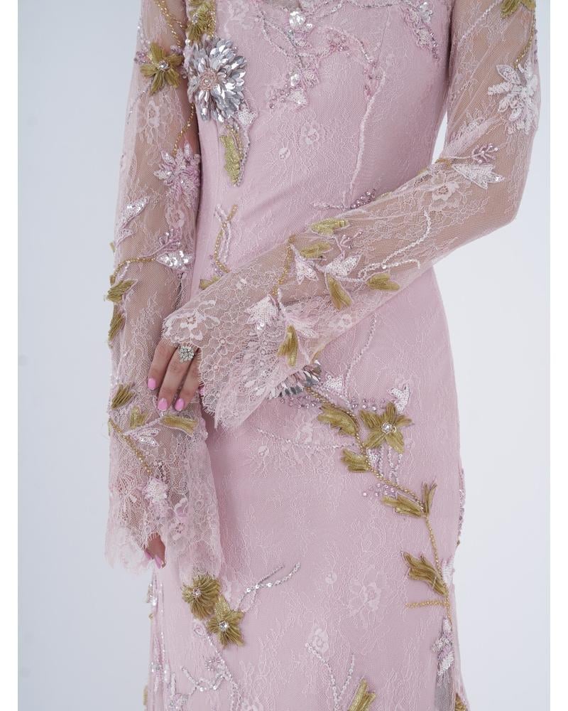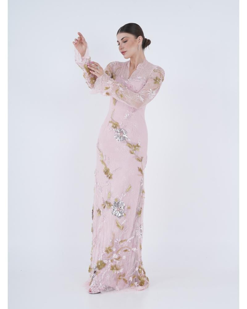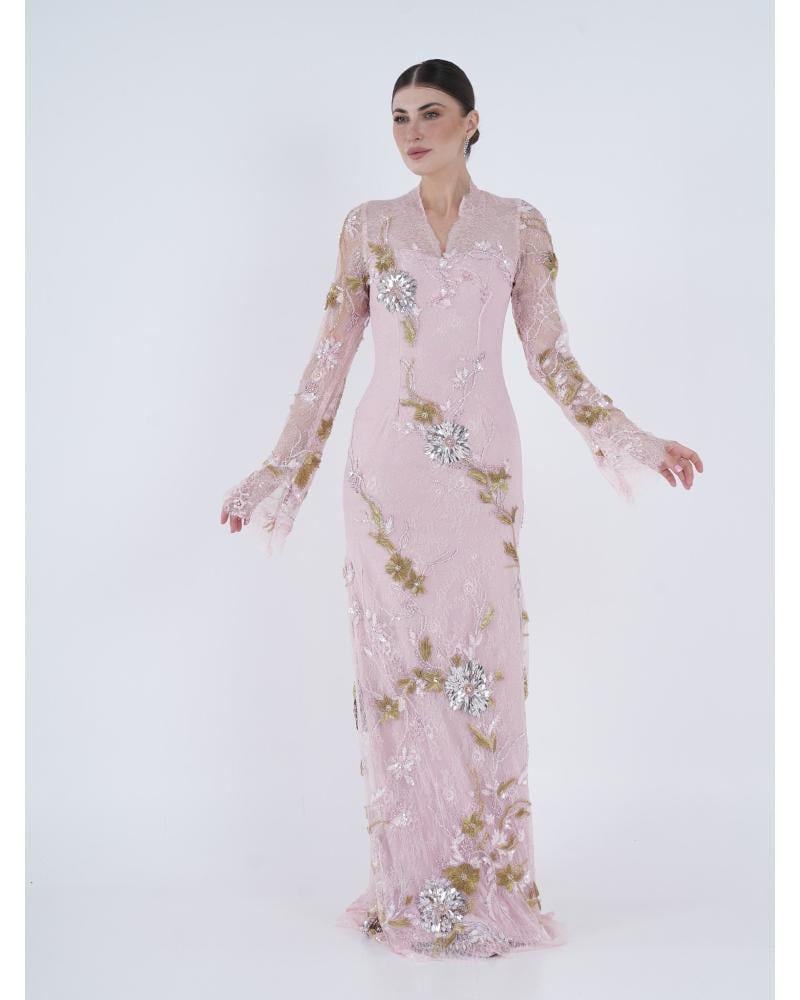 * فستان دانتيل وردي مزين بشك يدوي بالكريستالات والفصوص .