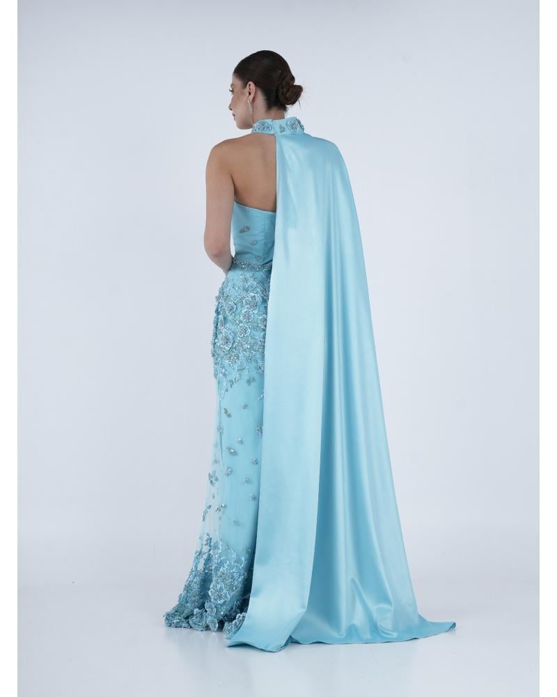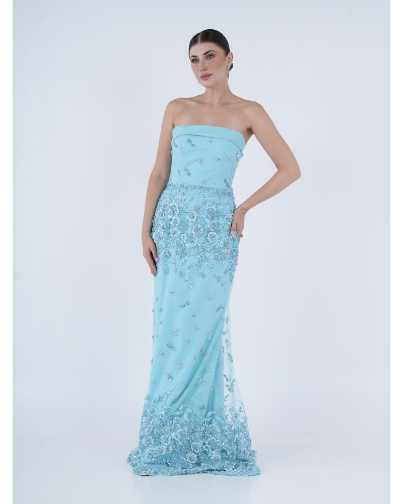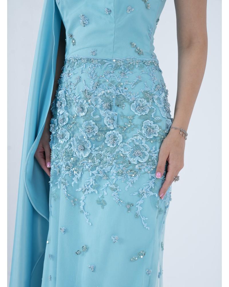 * فستان سماوي قطعتين توب وياقة رقبة مزين بطبعات 3Dورد وشك يدوي وقماش كريب حرير .