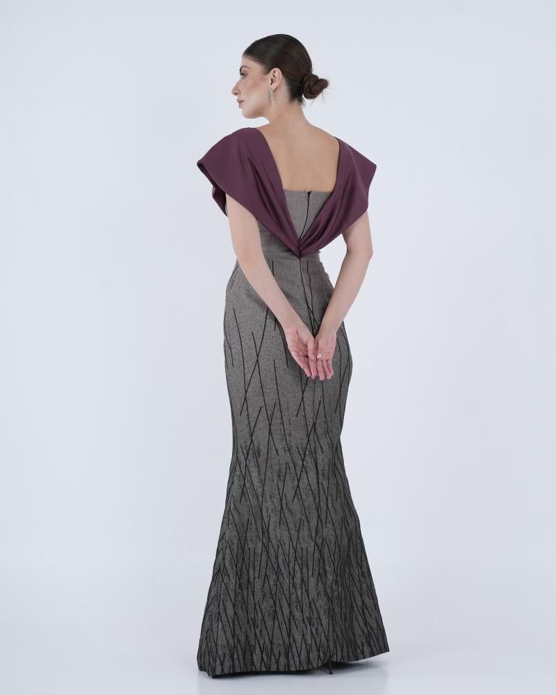 - فستان أوف شولدر مصنوع من قماش بالأسود والرمادي مع تطريزات سوداء دقيقة.
